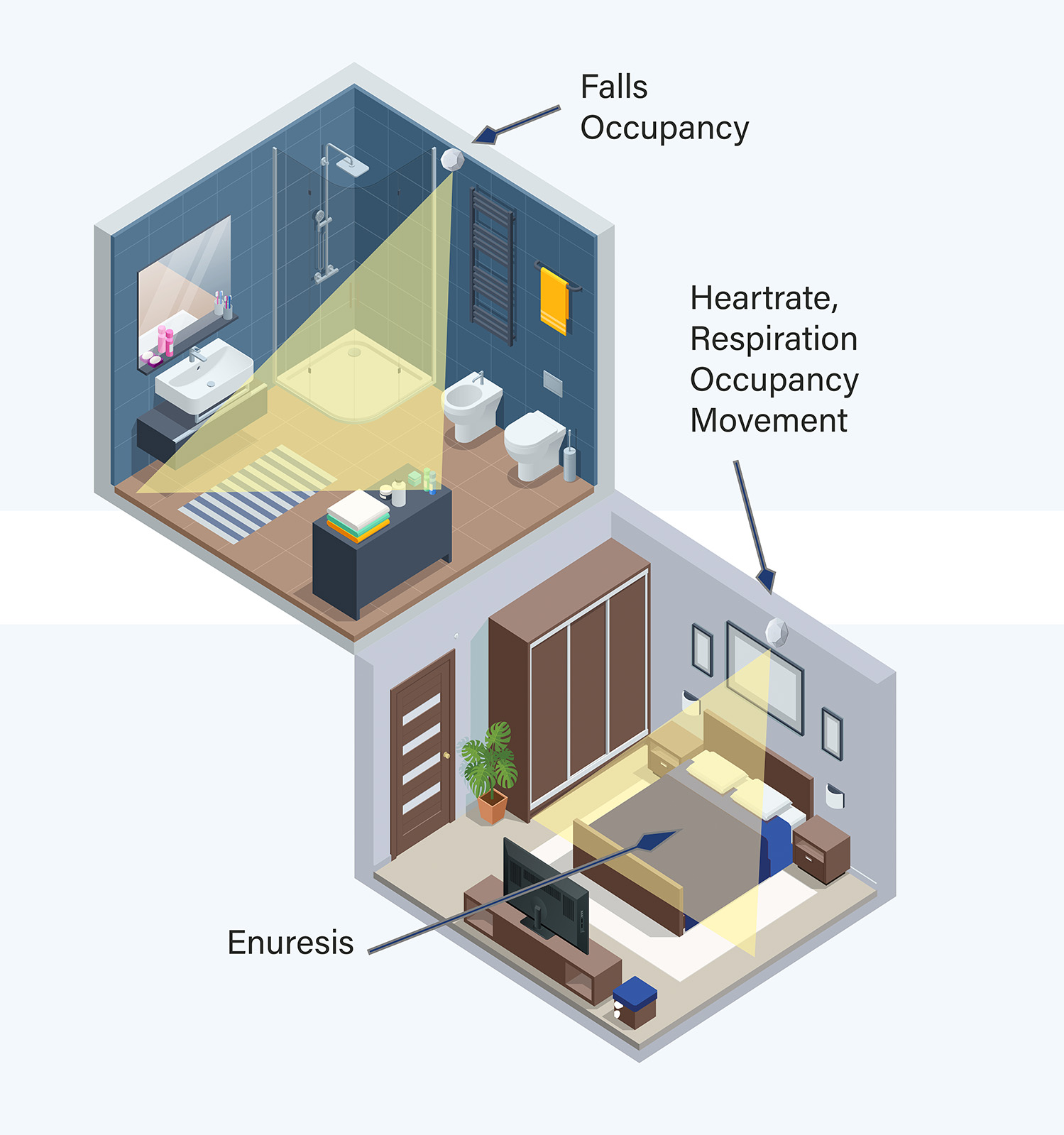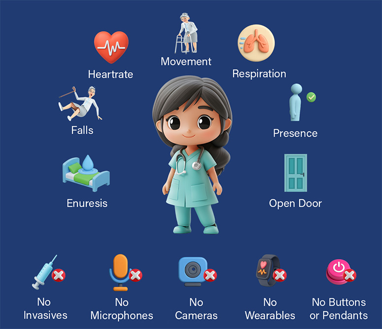 vytalcare utilises advance radar and sensor technology to track core signs of life such as breathing, heart-rate, presence, movement, and fall and enuresis detection, whilst also detecting anomalies in the room through advanced algorithms. No physical contact, no wearables, no buttons, no camera, and no microphones.